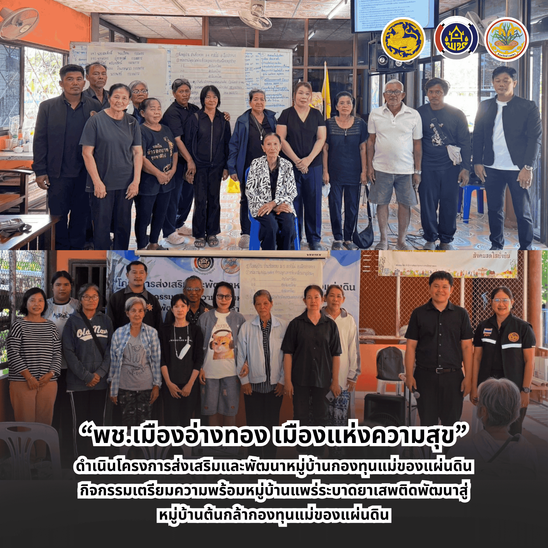 "พช.เมืองอ่างทอง เมืองแห่งความสุข" ดำเนินโครงการส่งเสริมและพัฒนาหมู่บ้านกองทุนแม่ของแผ่นดิน กิจกรรมเตรียมความพร้อมหมู่บ้านแพร่ระบาดยาเสพติดพัฒนาสู่หมู่บ้านต้นกล้ากองทุนแม่ของแผ่นดิน