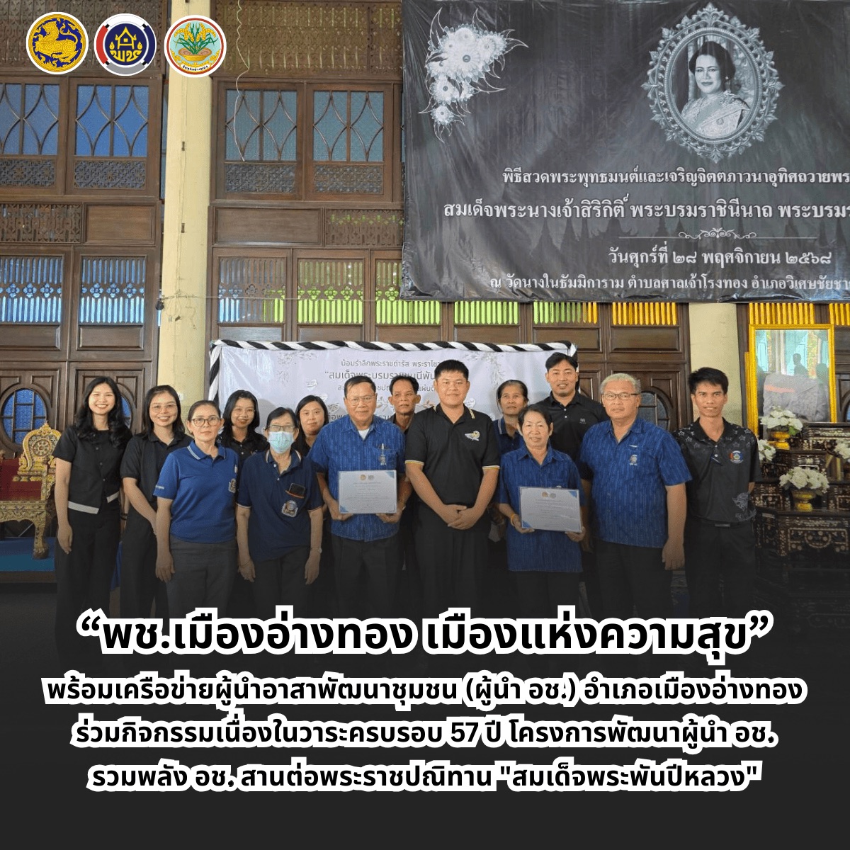 ในการนี้นายประวิทย์ ษรสา พัฒนาการอำเภอเมืองอ่างทอง พร้อมด้วยเครือข่ายผู้นำอาสาพัฒนาชุมชน (ผู้นำ อช.) อำเภอเมืองอ่างทอง และเจ้าหน้าที่พัฒนาชุมชนอำเภอ ร่วมกิจกรรมเนื่องในวาระครบรอบ 57 ปี โครงการพัฒนาผู้นำอาสาพัฒนาชุมชน ภายใต้แนวคิด รวมพลัง อช. สานต่อพระราชปณิทาน "สมเด็จพระพันปีหลวง" และร่วมแสดงความยินดีกับ นายถวิล กลิ่นบุญมา ผู้นำอาสาพัฒนาชุมชน ชาย และนางสาวพจนา กระจ่างศรี ผู้นำอาสาพัฒนาชุมชนหญิง ประจำตำบลจำปาหล่อ อำเภอเมืองอ่างทอง จังหวัดอ่างทอง ที่ได้รับ ประกาศเกียรติคุณ ผู้นำอาสาพัฒนาชุมชนที่มีผลงานดีเด่น ด้านการขับเคลื่อนงานพัฒนาชุมชนประจำปี 2568 ในครั้งนี้ด้วย