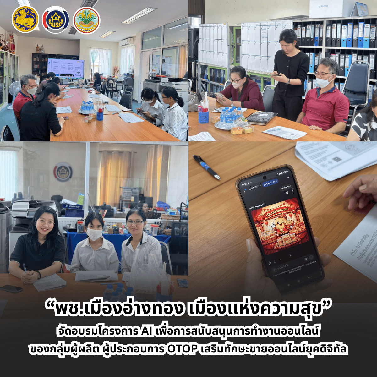 “พช.เมืองอ่างทอง เมืองแห่งความสุข” จัดอบรมโครงการ AI เพื่อการสนับสนุนการทำงานออนไลน์ของกลุ่มผู้ผลิต ผู้ประกอบการ OTOP เสริมทักษะขายออนไลน์ยุคดิจิทัล