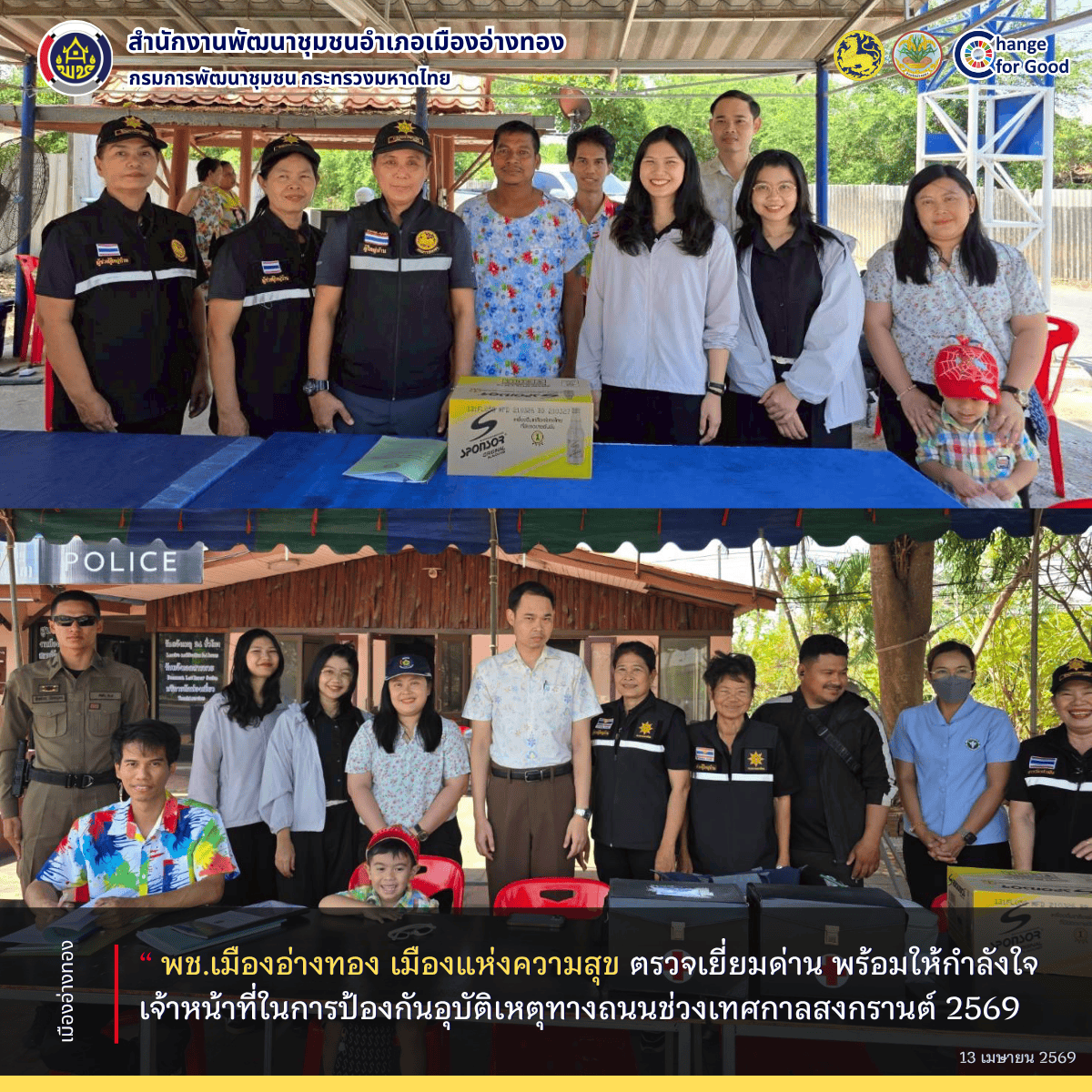 “พช.เมืองอ่างทอง เมืองแห่งความสุข” ตรวจเยี่ยมด่าน พร้อมให้กำลังใจเจ้าหน้าที่ ในการป้องกันและลดอุบัติเหตุทางถนนช่วงเทศกาลสงกรานต์ 2569 ณ จุดตรวจ จุดบริการ จุดด่านชุมชน ในพื้นที่อำเภอเมืองอ่างทอง